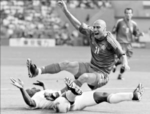 los pocos minutos de iniciado el complemento, el defensa Taribo West chocó