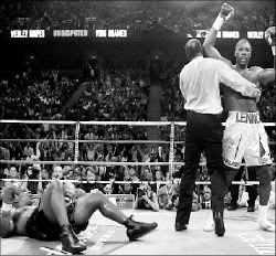 Lewis salió al octavo round con una amplia ventaja en las tarjetas y conectó un gancho de izquierda al mentón de Tyson, quien aflojó las piernas para el primer conteo. Segundos después, Tyson recibía un derechazo al rostro, golpe decisivo que lo envió a la lona para que el árbitro Eddie Cotton detuviera el desigual combate.