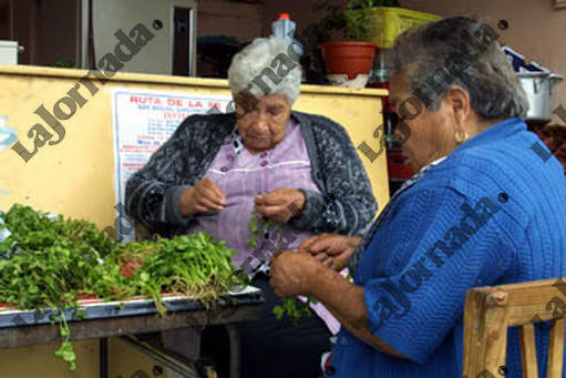 Mujeres ancianas limpian cilantro, en San Salvador Atenco, el 08 de junio de 2002.LA JORNADA/ Maria Luisa Severiano