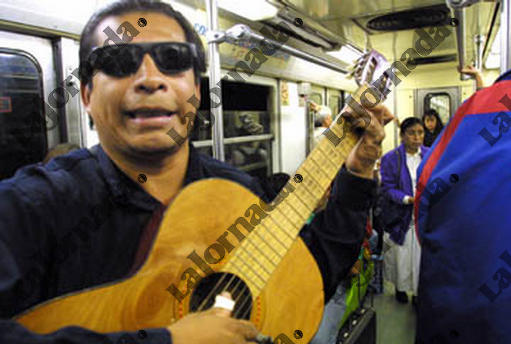 Invidentes cantan en un vagon del Metro unas bonitas canciones mexicanas y reciben dinero del agradecido pasaje, el 08 de junio de 2002. LA JORNADA/ Jose Antonio Lopez