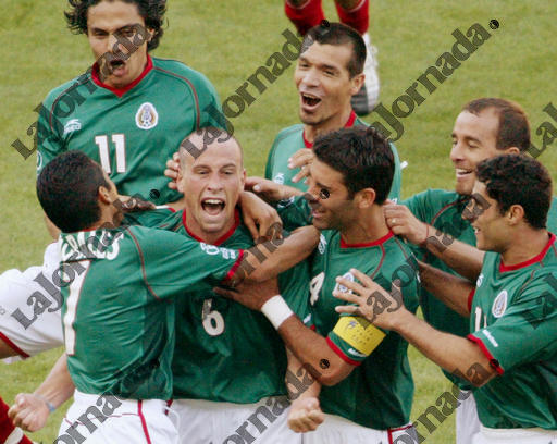 Mexico\'s Gerardo Torrado (6) celebrates his goal with team mates Ramon Morales (L), team captain Rafael Marquez (3rdL), Joahan Rodriguez (2ndR), Salvador Carmona (R), Braulio Luna (backL) and Jared Borgetti (backR) during a group G match against Ecuador at the World Cup Finals in Sendai June 9, 2002. REUTERS/Ian Waldie