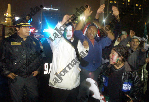 Aficionados vigilados por policias, festejan en el Angel de la Independencia previo al inicio del juego entre la Seleccion de Mexico y la de Ecuador. 08 de junio del 2002 LA JORNADA/ Francisco Olvera