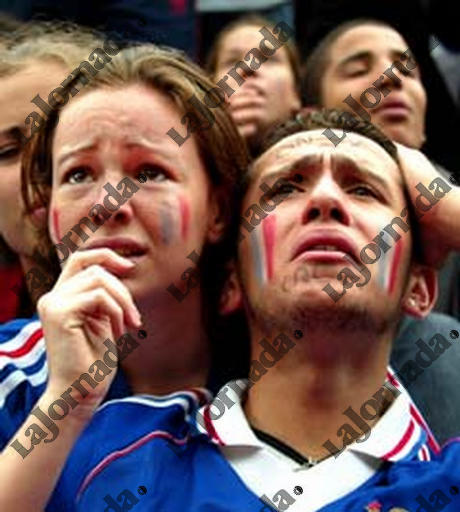| French soccer team supporters react in Paris as they watch the match between France and Denmark on a giant screen in the soccer world cup June 11, 2002. France. Defending champions France went out of the World cup finals in the first round after a 2-0 defeat by Denmark. REUTERS/Eric Gaillard |