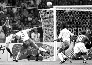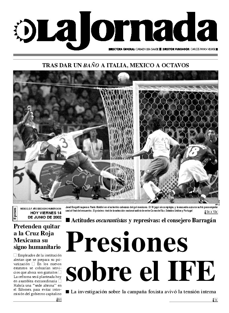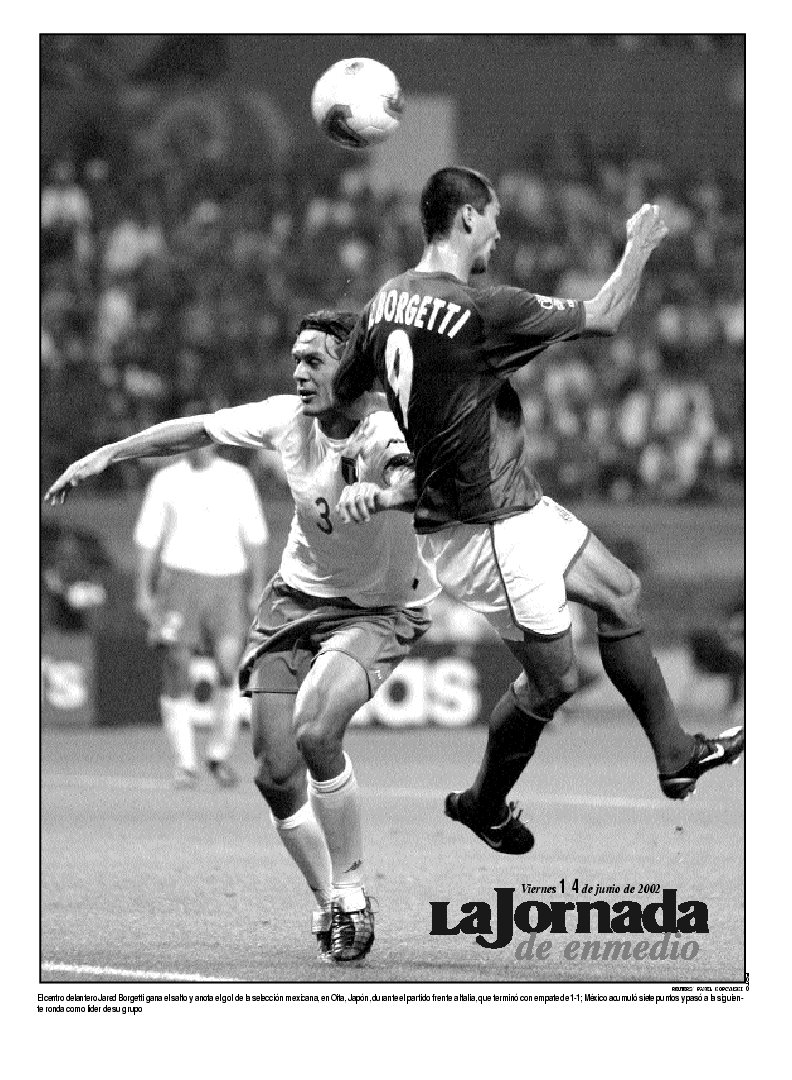 Jared Borgetti supera a Paolo Maldini en el soberbio cabezazo del gol mexicano. El Tri jugó sin complejos, y la escuadra azzurra sufrió para empatar casi al final del encuentro. El próximo rival de la selección nacional saldrá de entre Corea del Sur, Estados Unidos y Portugal FOTO AFP