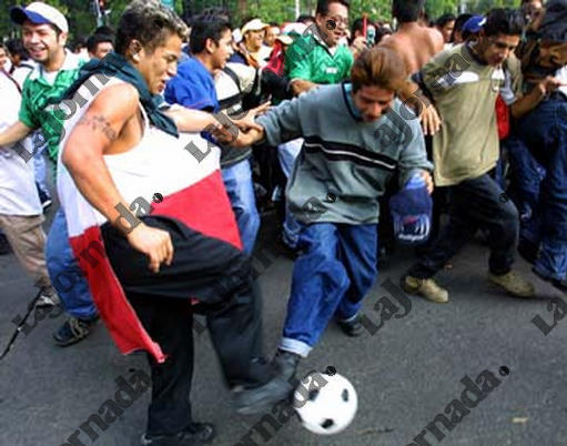 Fanaticos juegan futbol en los alrededores del angel de la independencia, durante los festejos por el pase a la siguiente ronda del la seleccion nacional en el mundial, el 13 de Junio del 2002. LA JORNADA/ Jose Carlo Gonzalez