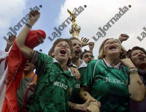 Aficionados festejan el triunfo del equipo Mexicano, durante su partido contra Italia, en el angel de la independencia, el 13 de Junio del 2002. LA JORNADA/ Francisco Olvera.