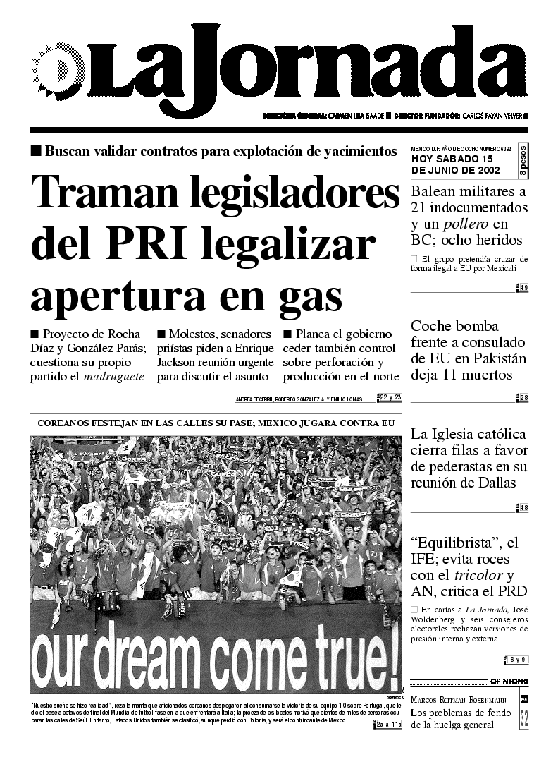 ``Nuestro sueño se hizo realidad'', reza la manta que aficionados coreanos desplegaron al consumarse la victoria de su equipo 1-0 sobre Portugal, que le dio el pase a octavos de final del Mundial de futbol, fase en la que enfrentará a Italia; la proeza de los locales motivó que cientos de miles de personas ocuparan las calles de Seúl. En tanto, Estados Unidos también se clasificó, aunque perdió con Polonia, y será el contrincante de México FOTO REUTERS
