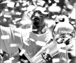 Kobe Bryant, de los Lakers, fue uno de los jugadores más ovacionados en los festejos por haber conseguido el campeonato de la NBA FOTO AFP