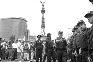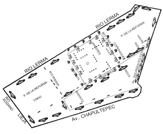 En torno al Angel se establecerán tres cinturones de control; el primero incluirá las calles Varsovia, desde Río Lerma hasta Hamburgo, y de ésta a Río Sena, en forma rectangular. Se distribuirán 10 barreras de policías preventivos, y unidades de los agrupamientos femenil por dentro, y de granaderos por fuera; en total serán 800 uniformados con 23 vehículos, y 199 policías más en torno de la columna.