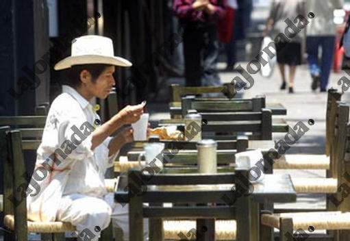 Un indigena desayuna en un Coffe Shop en la calle de Gante, en el Centro Historico de la Ciudad de Mexico, desafiando cualquier sentimiento racista, el 15 de junio de 2002. Foto: LA JORNADA/ Carlos Cisneros