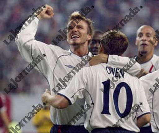 English captain and midfielder David Beckham (L) congratulates his teammate Michael Owen after he scored their team\'s second goal during the second round match Denmark/England in the 2002 FIFA World Cup in Korea and Japan, 15 June 2002 at Niigata Big Swan Stadium. England defeated Denmark 3-0 to advance to the quarterfinal. AFP PHOTO TOSHIFUMI KITAMURA