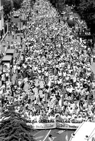 Cientos de miles de sindicalistas marcharon por las principales ciudades -en la imagen, Granada- en rechazo a las reformas laborales del gobierno. La mayor movilización ocurrió en Barcelona, donde las centrales obreras calcularon que acudieron 500 mil trabajadores. Sin embargo, el sentir de José María Aznar es que la ``huelga no existió'' FOTO afp