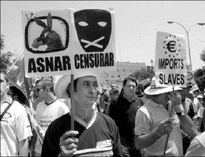 Pero los miles de manifestantes, rodeados de un hermético dispositivo policial, convirtieron la protesta en un acto reivindicativo de al menos tres derechos que consideran suprimidos por las medidas reformistas de Aznar: el de la protección al desempleo, la garantía de un juicio justo por despido improcedente y la eliminación del subsidio agrario, que afecta a miles de familias de los campos del sur del país.