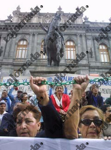 Jubilados y Pensionados de PEMEX de Poza Rica, se manifestaron frente al Palacio de Mineria en donde el Presidente de la Republica Vicente Fox clausuraba un Foro, el 21 de junio de 2002. LA JORNADA / Francisco Olvera
