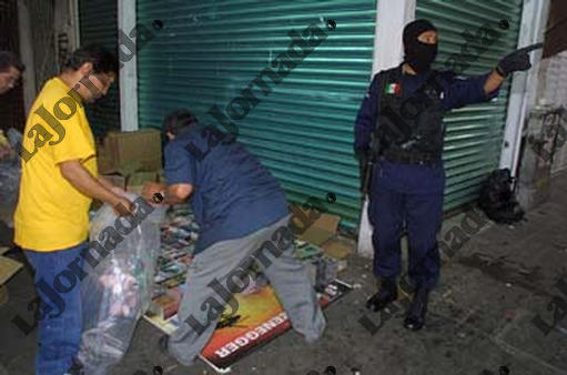 Operativo de la Agencia Federal de Investigaciones (AFI) en la calle de Aztecas y Eje 1 Norte para decomisar discos piratas, el 21 de junio del 2002. LA JORNADA/ Jose Carlo Gonzalez