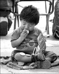 Hijo de una familia indigente come