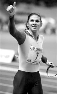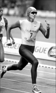 La sonorense salió con gafas y con una combinación aerodinámica que le cubría la cabeza y, pese a que la pista se encontraba mojada debido a la intensa lluvia que cayó en París, encabezó la carrera desde el inicio para entrar triunfal a la meta del estadio de Francia, sede de la final de la Copa del Mundo de futbol en 1998.