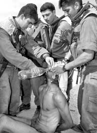 Militares dan de beber a uno de los dos palestinos que fueron capturados en los alrededores de un asentamiento israelí cerca de Gaza. Las fuerzas de Tel Aviv aseguraron que se trata de integrantes de un escuadrón que preparaba un atentado FOTO REUTERS