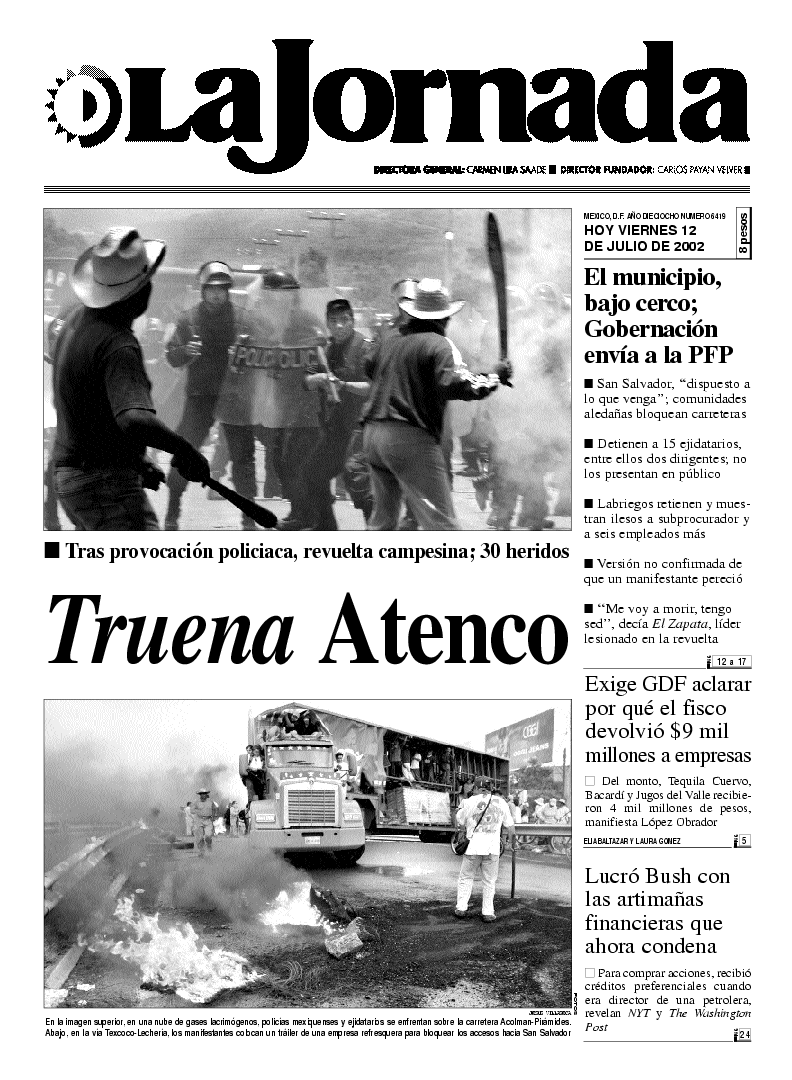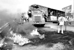En la imagen superior, en una nube de gases lacrimógenos, policías mexiquenses y ejidatarios se enfrentan sobre la carretera Acolman-Pirámides. Abajo, en la vía Texcoco-Lechería, los manifestantes colocan un tráiler de una empresa refresquera para bloquear los accesos hacia San Salvador Atenco FOTO JESUS VILLASECA