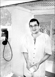 A través de un cristal a prueba de balas y de sonido, Suárez conversa con la ayuda de un teléfono colocado en el estrecho cubículo de entrevistas.