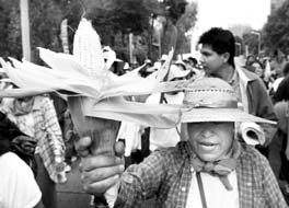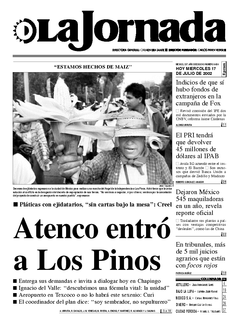 Decenas de ejidatarios regresaron a la ciudad de México para realizar una marcha del Angel de la Independencia a Los Pinos. Advirtieron que la única solución al conflicto es la derogación del decreto de expropiación de sus tierras. ``No venimos a negociar, ni por dinero; venimos por la cancelación del proyecto de construir un aeropuerto en nuestro pueblo'', expresaron FOTO JESUS VILLASECA