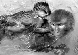 Un bebé mono trepa sobre la espalda de su madre que se refresca en una alberca del zoológico de Kyoto, Japón, donde las temperaturas han alcanzado 36 grados centigrados (98.8 Fahrenheit). FOTO REUTERS
