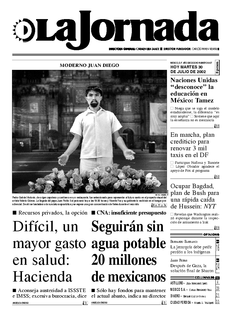 Pedro Gabriel Antonio, de origen zapoteco y cantinero en un restaurante, fue seleccionado para representar al futuro santo en el proyecto visual del artista Valerio Gómez. La llegada del papa Juan Pablo II al país será hoy a las 19:30 horas y Vicente Fox y su gabinete lo recibirán en el hangar presidencial. De ahí se trasladará a la nunciatura apostólica y se espera una gran concentración de fieles durante el recorrido FOTO Pavka segura