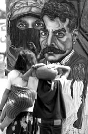 Mural de Javier Campos (Cienfuegos) que fue creado durante las movilizaciones en Atenco. El y otros artistas plásticos montaron una exposición con motivos zapatistas en el Zócalo capitalino FOTO MARCO PELAEZ