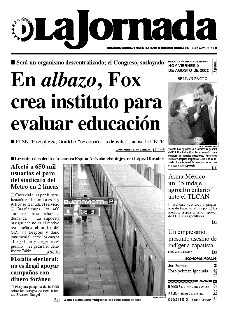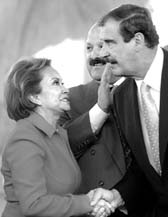 Vicente Fox agradece a la secretaria general del PRI, Elba Esther Gordillo, su respaldo para concretar los cambios educativos. ``Primero es México y después mi partido'', expresó la llamada dirigente moral de maestros, en acto en el Museo de Antropología FOTO JOSE CARLO GONZALEZ
