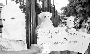 Con capuchas blancas y veladoras encendidas, personas infectadas con el virus de inmunodeficiencia humana (VIH) se plantaron frente al Hospital General de Veracruz, en protesta por el desabasto de medicamentos desde abril pasado. Los manifestantes exigieron la renuncia del secretario de Salud estatal, Mauro Loyo Varela, y del director del hospital, Julio César Gómez, a quienes responsabilizan de la falta de fármacos que, aseguran, ya costó la vida a cinco personas FOTO MIGUEL LOPEZ