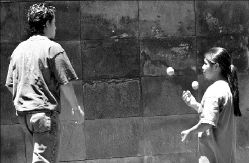 Una niña hace malabares para pedir unas monedas