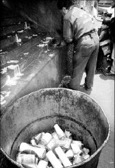 Un trabajador retira veladoras usadas, en