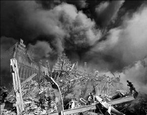 un bombero que revisa las ruinas humeantes de las Torres Gemelas luego