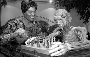 Eulinda Clarke-Akalanne, de 60 años, forma parte de un grupo de voluntarios que tomaron la determinación de donar su cuerpo cuando mueran para ser plastinados por el médico alemán Gunther von Hagens. El grupo de donadores visitó ayer la exposición en Londres. Allí, Eulinda ensayó un par de gambitos con uno de los cadáveres que forman parte de la exposición que ha causado fuerte polémica por sus implicaciones FOTO AFP