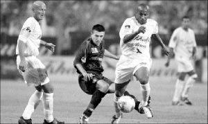 El defensa Manuel Dos Santos, del Marsella, gana el esférico a Eric Carriere, del Lyon FOTO