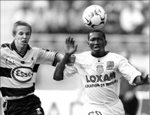 Benoit Pedretti, del Sochaux, intenta detener al camerunés del Nantes, Eric Djemba, en el futbol francés FOTO AFP