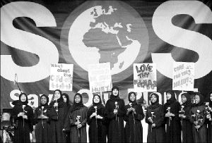 3 mil ecologistas, militantes antiglobalización, pacifistas, músicos,