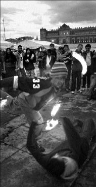 Jóvenes realizan malabares con fuego en el Zócalo FOTO JOSE ANTONIO LOPEZ