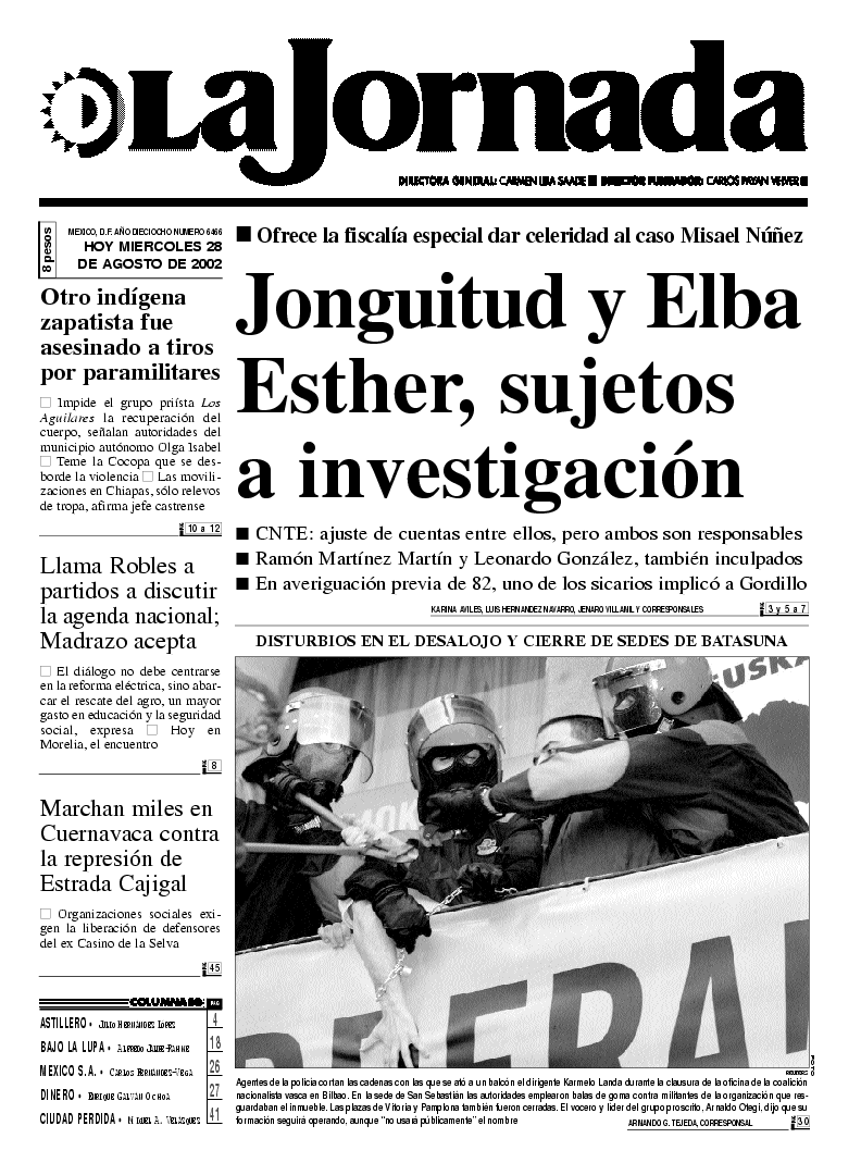 Impide el grupo priísta Los Aguilares la recuperación del cuerpo, señalan autoridades del municipio autónomo Olga Isabel Teme la Cocopa que se desborde la violencia Las movilizaciones en Chiapas, sólo relevos de tropa, afirma jefe castrense
