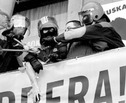 Agentes de la policía cortan las cadenas con las que se ató a un balcón el dirigente Karmelo Landa durante la clausura de la oficina de la coalición nacionalista vasca en Bilbao. En la sede de San Sebastián las autoridades emplearon balas de goma contra militantes de la organización que resguardaban el inmueble. Las plazas de Vitoria y Pamplona también fueron cerradas. El vocero y líder del grupo proscrito, Arnaldo Otegi, dijo que su formación seguirá operando, aunque ``no usará públicamente'' el nombre FOTO REUTERS