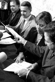 Alberto Anaya, del PT; Roberto Madrazo, del PRI; Rosario Robles, del PRD, y Bernardo de la Garza, del PVEM, firman el Acuerdo Político por México en la casa natal de Morelos, en Morelia FOTO CARLOS CISNEROS