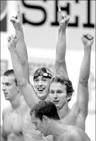 El cuarteto estadunidense (Lezak, Phelpes, Peirsol y Hansen)