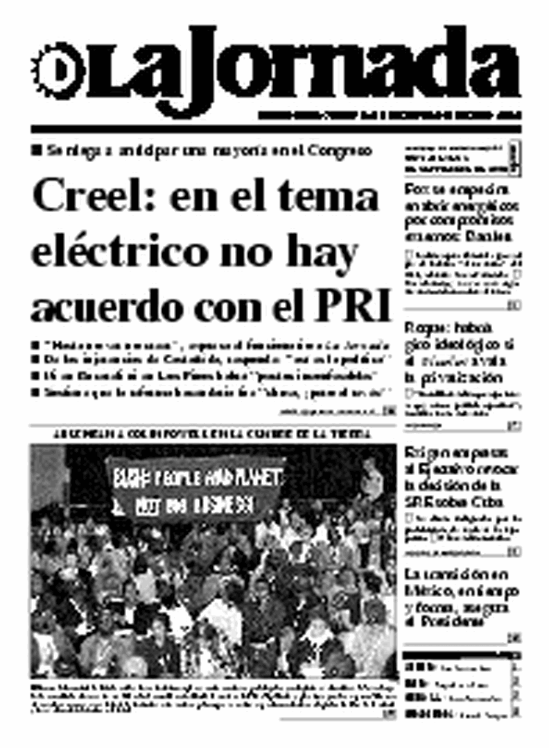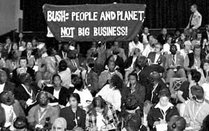 El discurso del secretario de Estado estadunidense fue interrumpido en varios ocasiones por delegados y ecologistas en el recinto en Johannesburgo donde se realizaba el encuentro mundial sobre desarrollo sostenible. En la manta se lee: ``Bush: población y planeta, no grandes empresas''. La reunión concluyó ayer con un sentimiento de frustración entre naciones pobres, que no confían en que las resoluciones adoptadas las libren de la miseria y frenen el creciente deterioro ambiental FOTO AFP