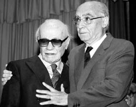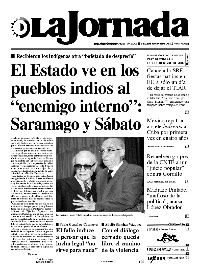 Los escritores Ernesto Sábato, argentino, y José Saramago, portugués, en abril pasado FOTO AFP,/b>
