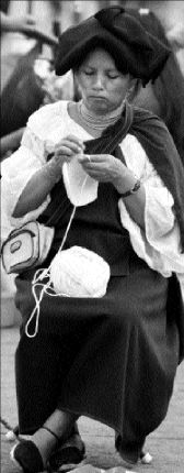 Una mujer indígena teje sentada frente a catedral
