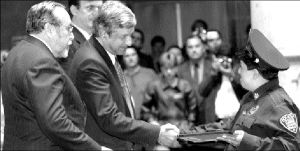 RECONOCIMIENTO AL DESEMPEÑO  Andrés Manuel López Obrador, Bernardo Bátiz y Marcelo Ebrard entregan reconocimientos a policías que se han destacado en el desempeño de su deber, en el Antiguo Palacio del Ayuntamiento FOTO MARIA LUISA SEVERIANO