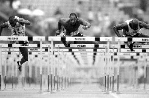 Allen Johnson (derecha), de EU; el campeón olímpico cubano Anier García (centro), y el británico Colin Jackson, poseedor del récord de los 110 con vallas, superan uno de los obstáculos en la competencia realizada en Yokohama, Japón. Johnson ganó la prueba, seguido de García, con tiempo de 13:28 segundos FOTO AFP