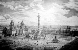 En 1823, en tiempos del efímero emperador Agustín de Iturbide, se erigió en Celaya, Guanajuato, el primer monumento a la Independencia de México, diseñado por el arquitecto Francisco Eduardo Tres Guerras; se trata de una columna con capitel corintio coronado con el símbolo de nuestra bandera: un águila devorando una serpiente. Posteriormente, en plena inestabilidad política de aquellos tiempos, se convocó, en 1843, a un concurso para edificar un gran monumento en el centro de la Plaza de Armas de la ciudad de México, el cual fue ganado por un arquitecto francés de nombre Enrique Griffón; pero Santa Anna, como era obvio y quizá por el acoso de los imperios europeos, lo rechazó y mandó hacer otro concurso que ganó el arquitecto Lorenzo de La Hidalga. Este proyecto aparece en una pintura de Pedro Gualdi de 1843, en la que se destaca, en la plaza, la gigantesca columna coronada no por un águila, sino por una figura alada con las manos abiertas. Los avatares militares impidieron concluirlo, y se construyó sólo el zócalo, que dio origen al nombre popular con que se conoce desde entonces nuestra Plaza de la Constitución.