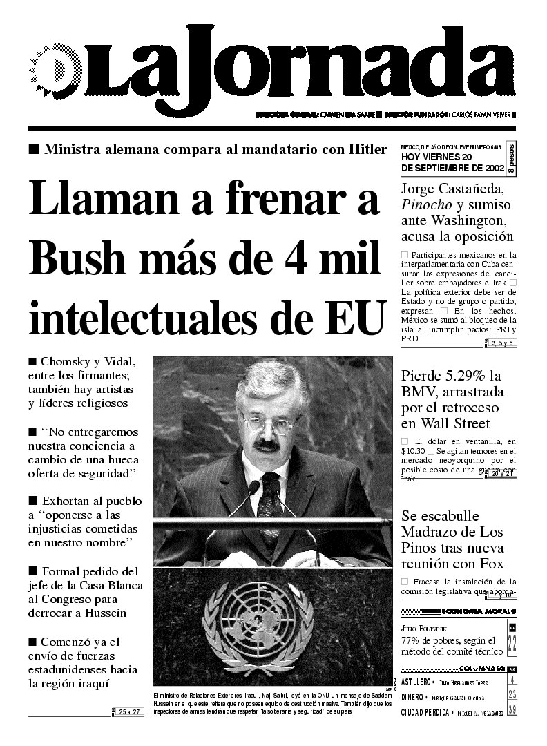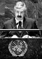 El ministro de Relaciones Exteriores iraquí, Naji Sabri, leyó en la ONU un mensaje de Saddam Hussein en el que éste reitera que no poseen equipo de destrucción masiva. También dijo que los inspectores de armas tendrán que respetar ``la soberanía y seguridad'' de su país FOTO AFP