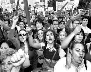 Entre consignas de ¡duro, duro, duro!, los trabajadores repetían la última frase de la arenga del secretario del Exterior y Propaganda del Sindicato de Trabajadores Petroleros de la República Mexicana (STPRM), Fernando Navarrete Pérez, quien en lo alto del templete instalado frente al monumento advertía en su mensaje al gobierno foxista: ''Hoy, aquí y en todo el país, la voz petrolera les dice -que se lo graben y lo tengan en su conciencia-: ¡unidos venceremos!''